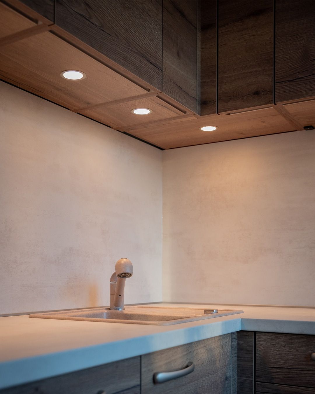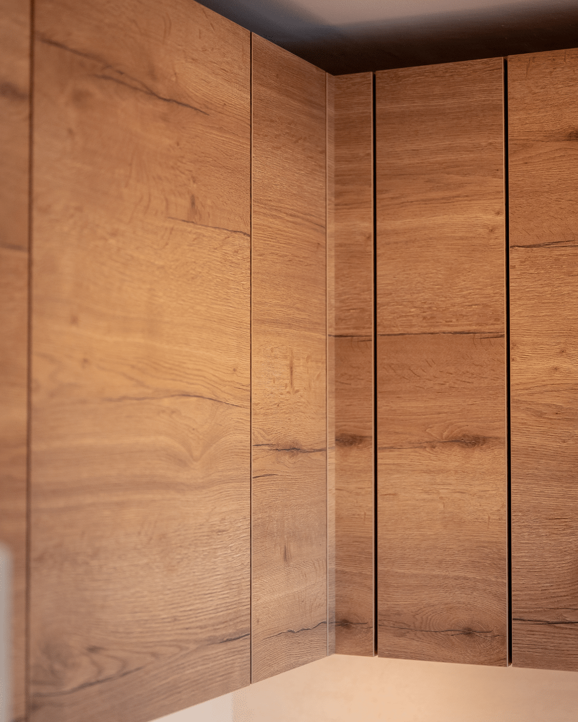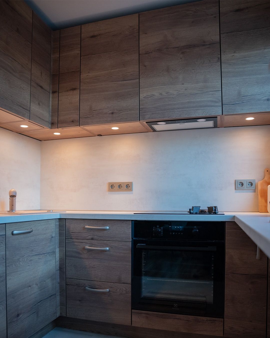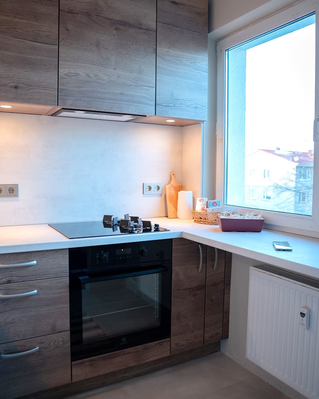 Väike köök paneelmaja korteris, kuhu tegime mitmeid erilahendusi. Moodne siledate ustega köök, kus uksed on Havanna tamme toonis, tööpind ning taust valge tsemendi reproduktsioon. Tööpind on laiendatud sujuvalt edasi aknalauaks. Tööpinna all on aga paremas nurgas ka erilahendusega kapp, kus paikneb kliendi gaasimõõdik. Köögiuksed on erineva laiusega, sest nii väldime ukse avanemist vastu radiaatorit.