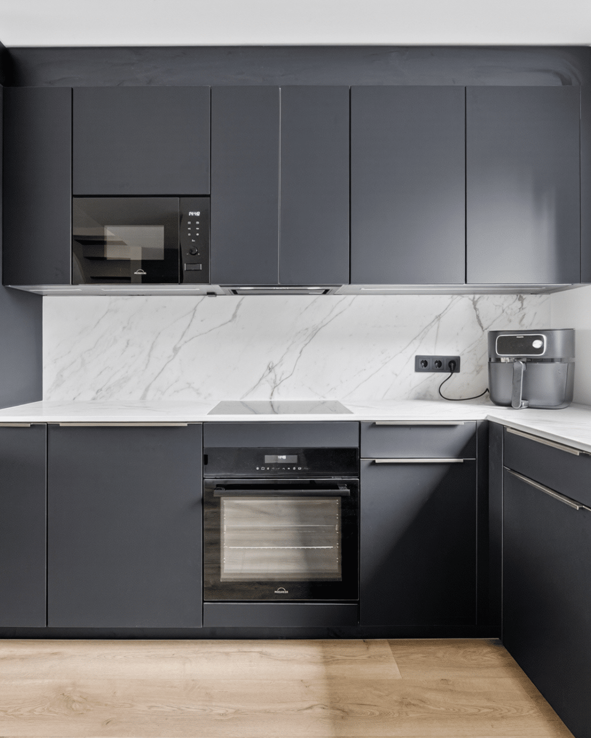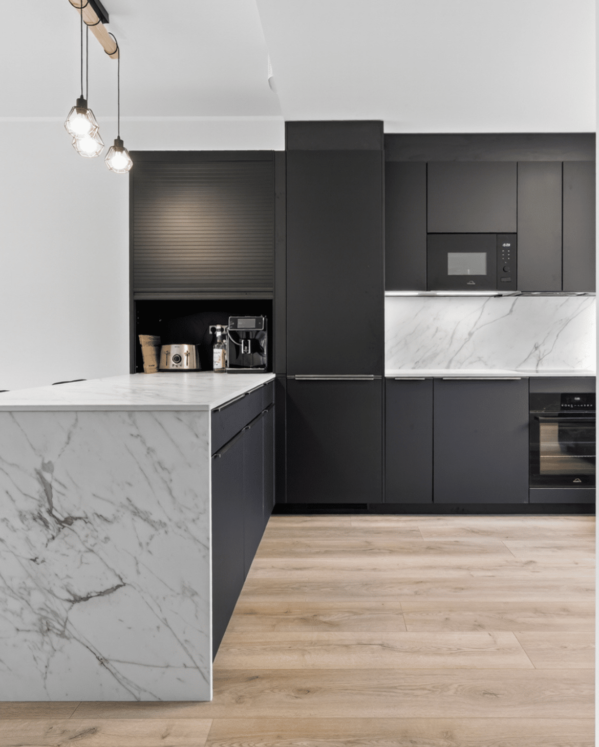 Sageli kardetakse, et tume köök muudab ruumi pimedaks ja väikseks, kuid see köök on suurepärane näide sellest, et õige disainiga on ka säärane köök ruumikas ja avar.
