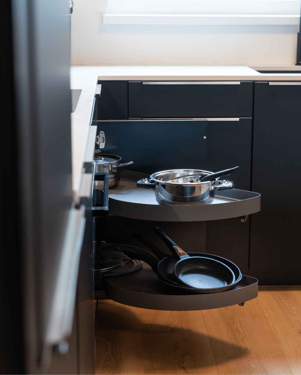 Tasapinna puhtana hoidmiseks on köögis nutikad lahendused – karusellid nurkades ja mahukad kapid köögisaare all, mis pakuvad praktilist panipaika. Saarel on liuguksega ribiuks, mille taha saab mugavalt peita kohvimasina.
