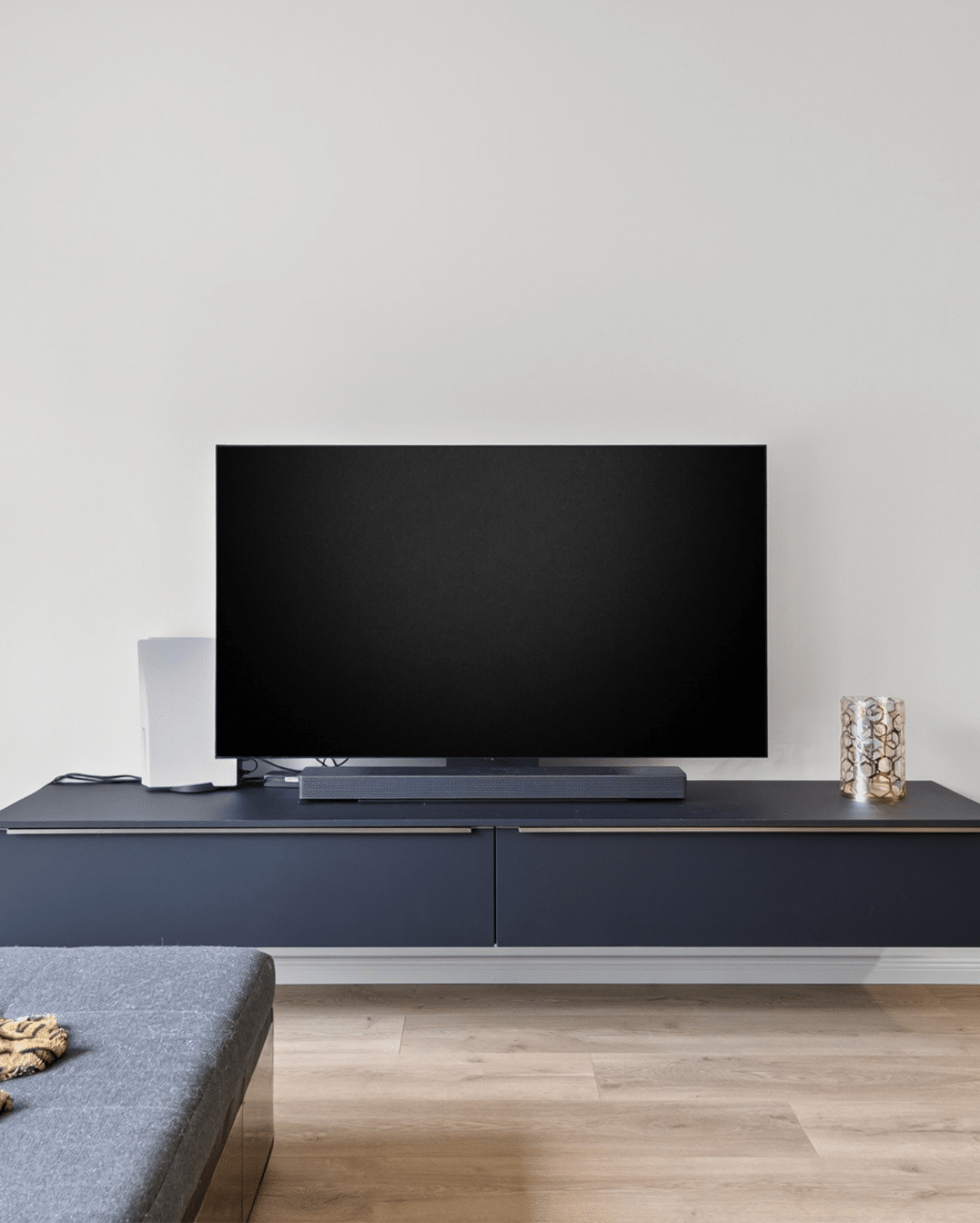 Kuna köök on avatud planeeringuga, tellis klient ühtse ilme huvides ka samas toonis ja materjaliga telerialuse, mis loob üheskoos köögiga harmoonilise ja stiilse terviku.