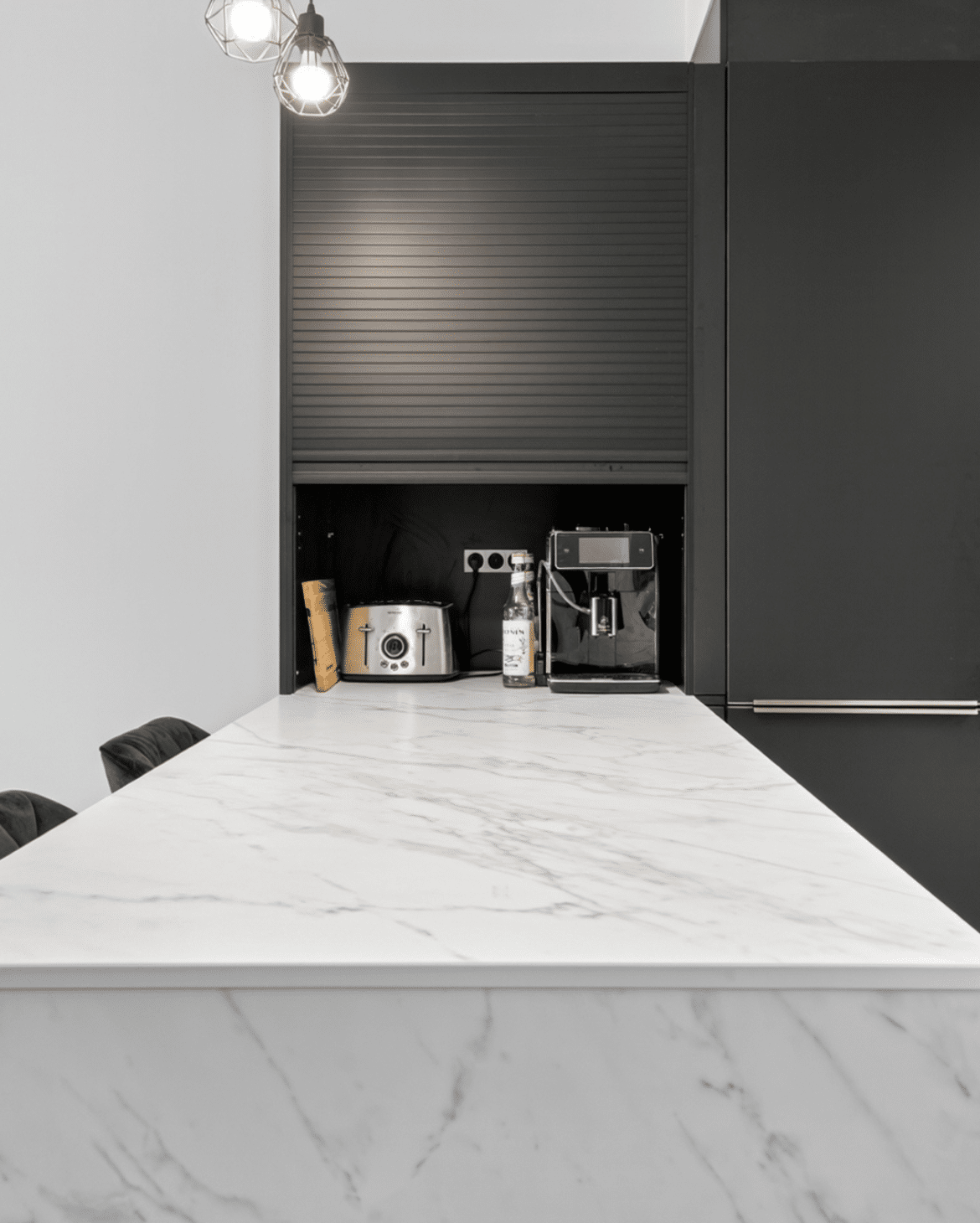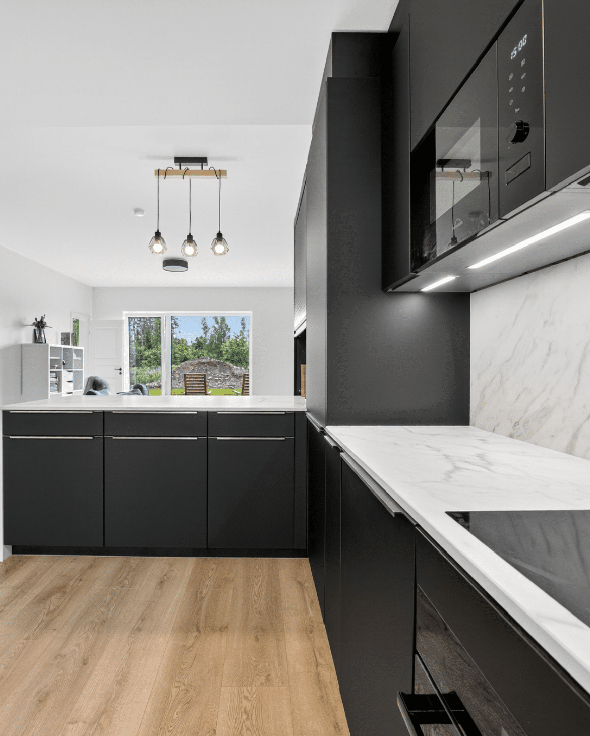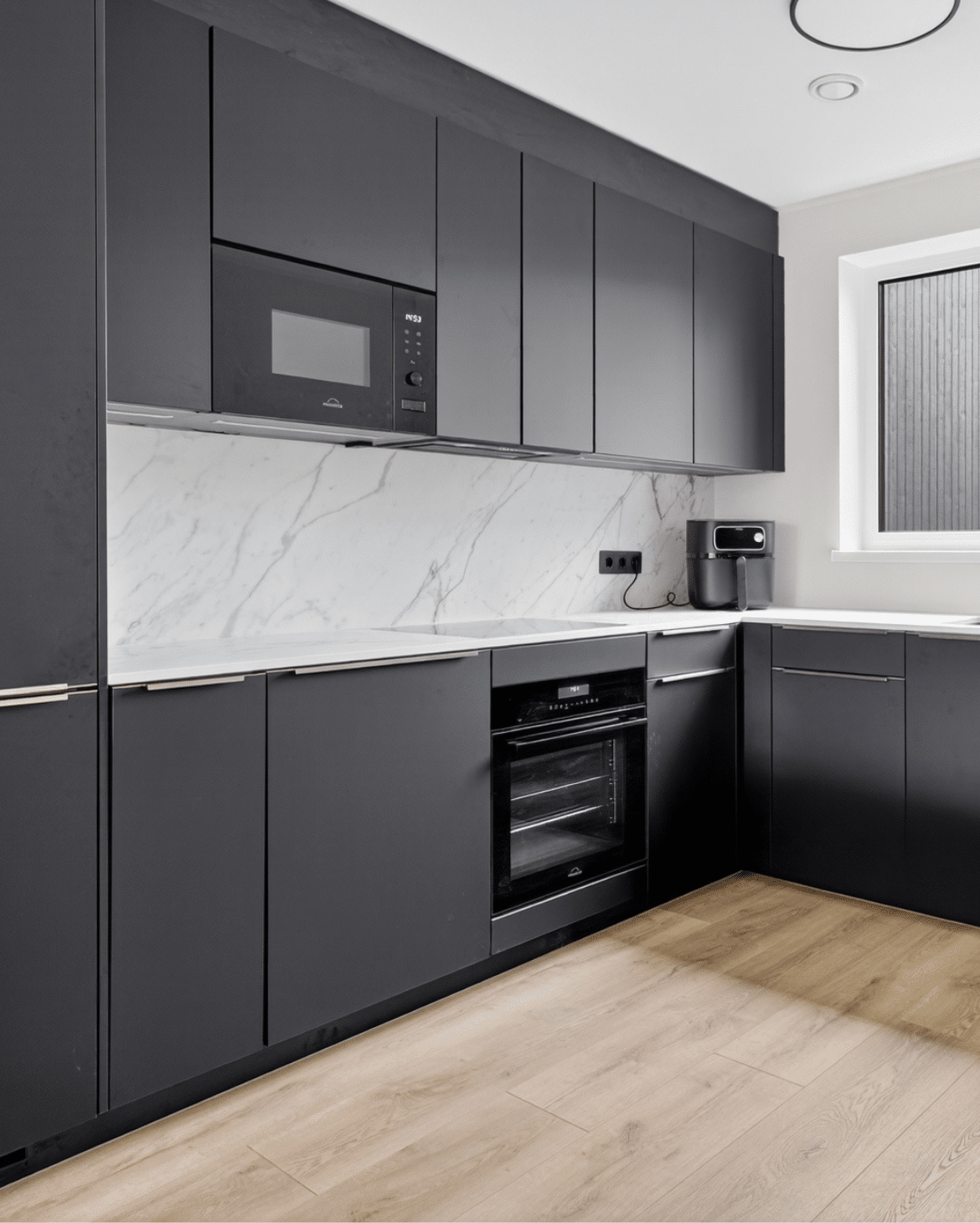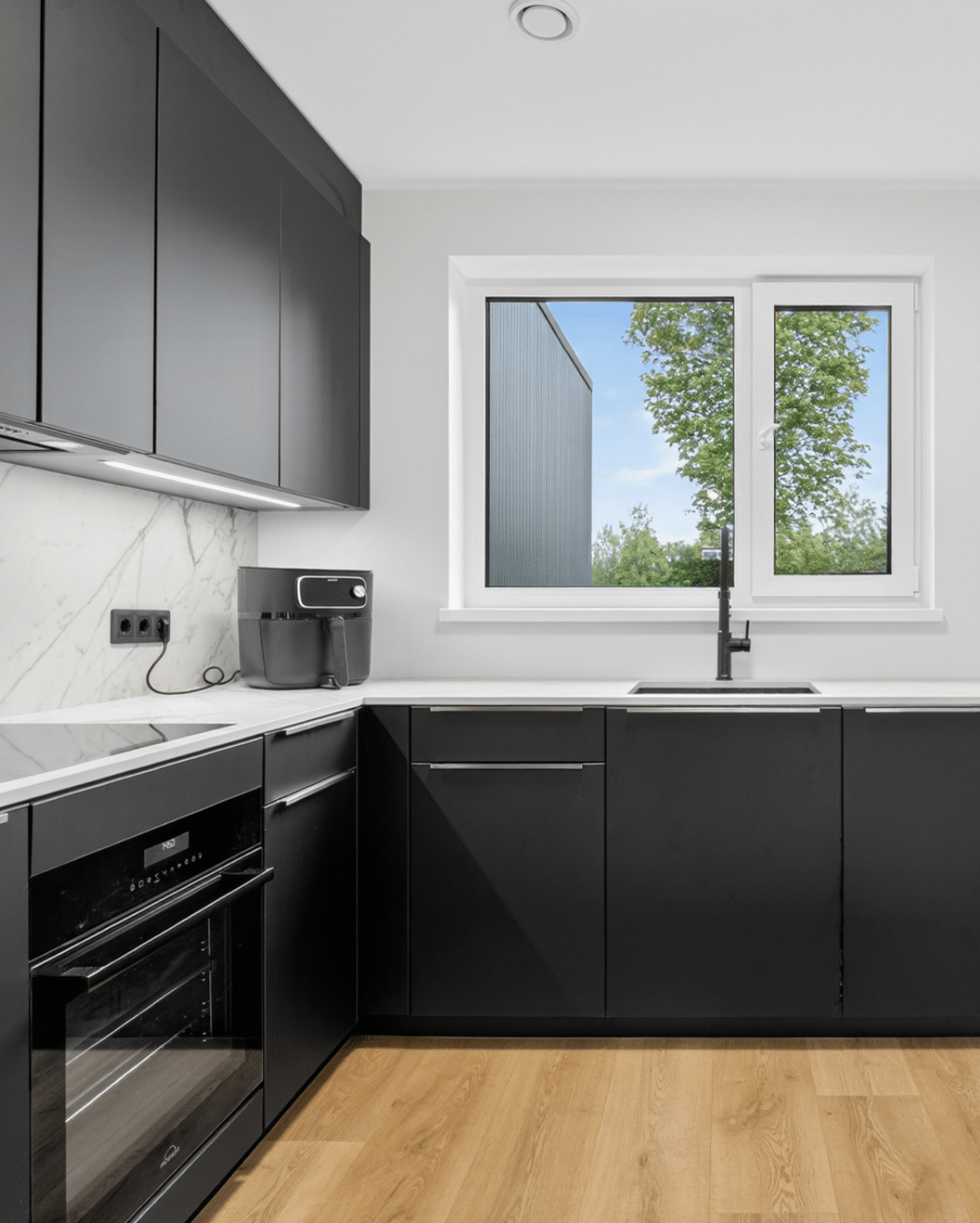 Selle köögi puhul on kasutatud populaarset musta EasyTouch-paneeli, mis ei jäta sõrmejälgi nähtavaks. Efektse kontrasti loomiseks valisime tööpinnaks Marazzi Golden White keraamilise plaadi. Kogu tehnika on tasapinda integreeritud, et puhastustööd oleksid võimalikult lihtsad ja mugavad!