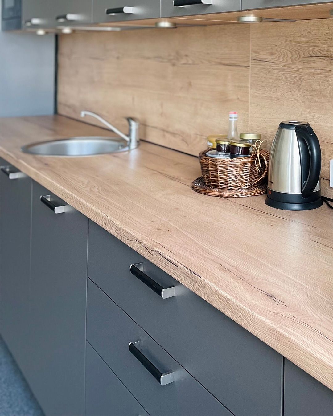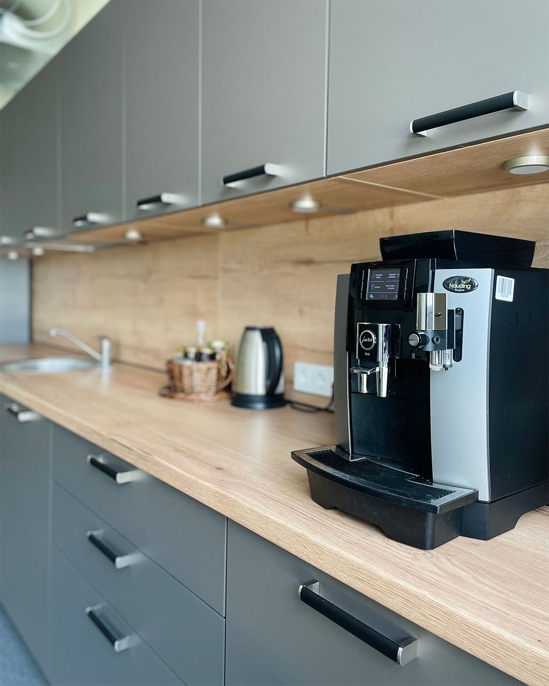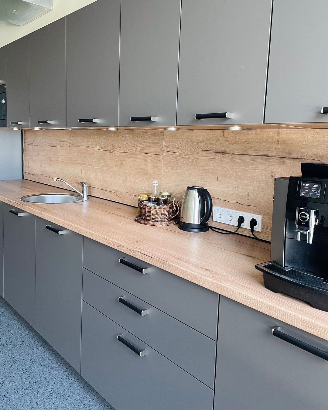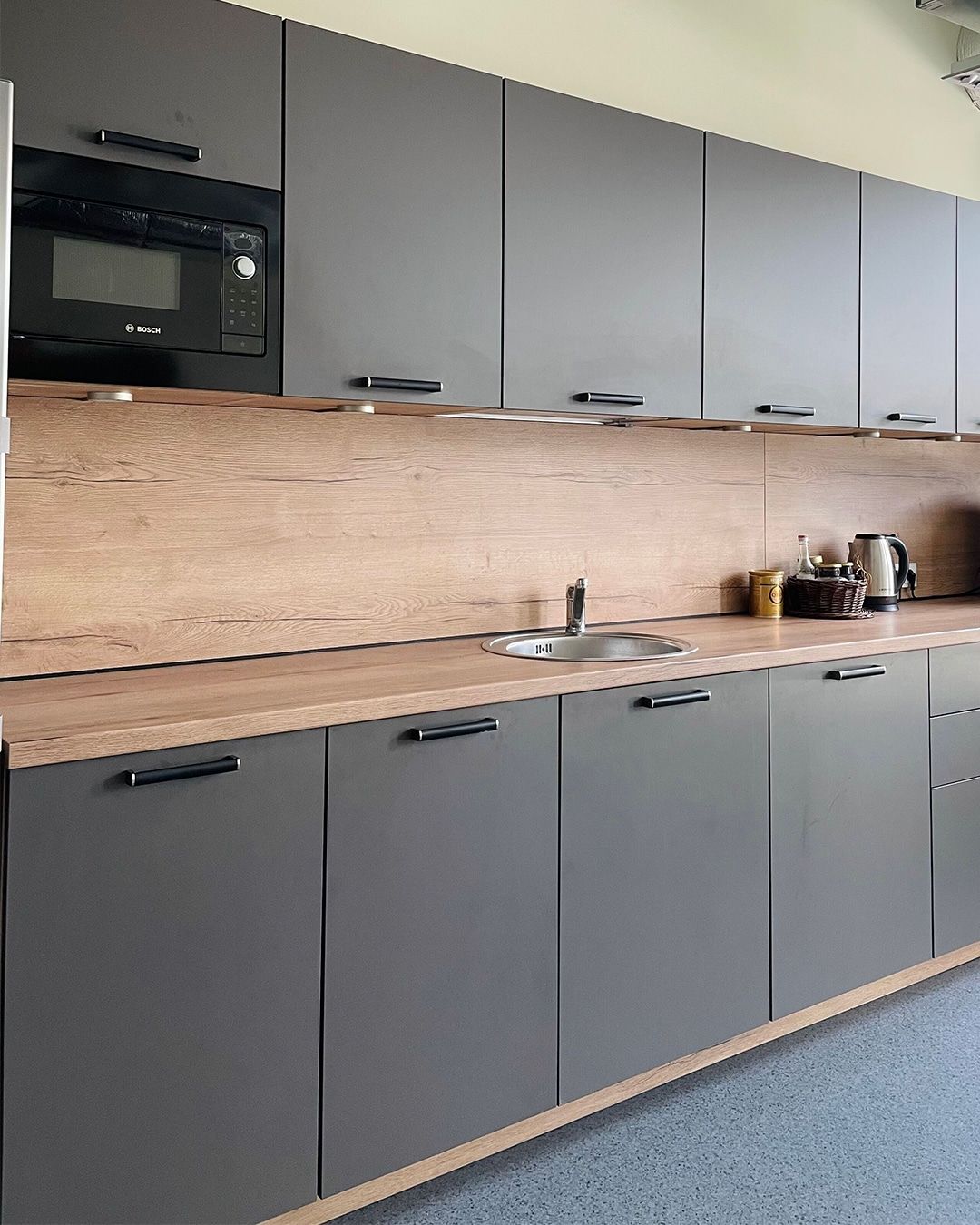 Köök on sarjast Laser: köögiuksed on Volcanic Grey tooni, taust ja tööpind aga tammepuu karva. Käepidemed on mugavad, et uksi saaks hõlpsasti avada. Valgustid on muudetava soojuse ning tugevusega, mis sobitub kenasti muu ruumi valgustusega. Selles konkreetses kontoris tellija soovil pliiti ja ahju ei ole, kuid sinu tellimusse saab need soovi korral kindlasti lisada!
